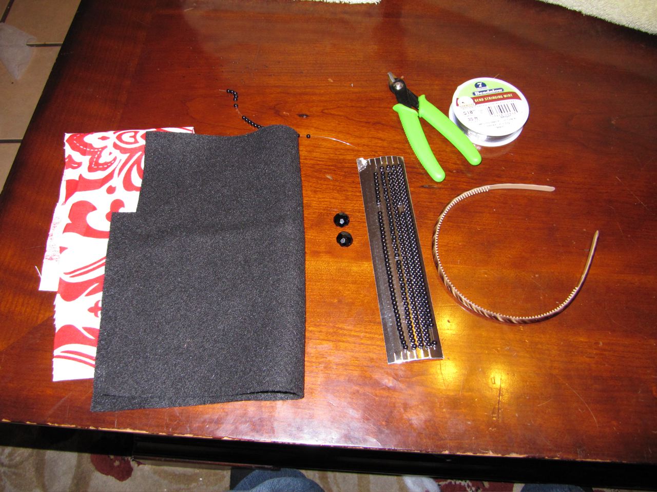Cute, huh? But at $32, I knew it wasn't meant for my little girl's head...So, in comes my cheap make-it-yourself attitude. :)I just gathered some supplies, black beads left over from the spider project, black felt, and hot glue. (I was going to use the headband, but it was brown, and Emma hates headbands, so I switched to a BIG snap clip.)