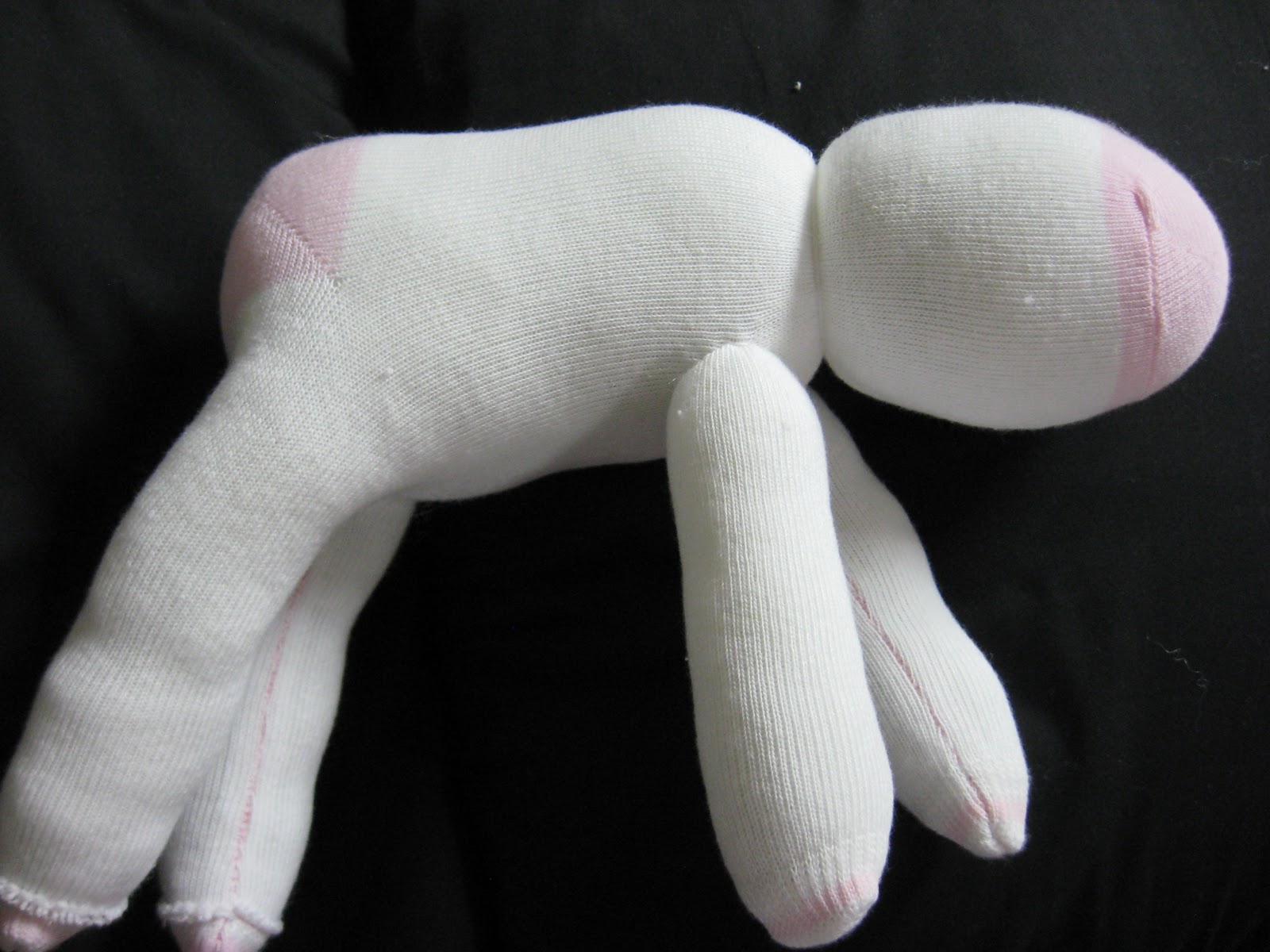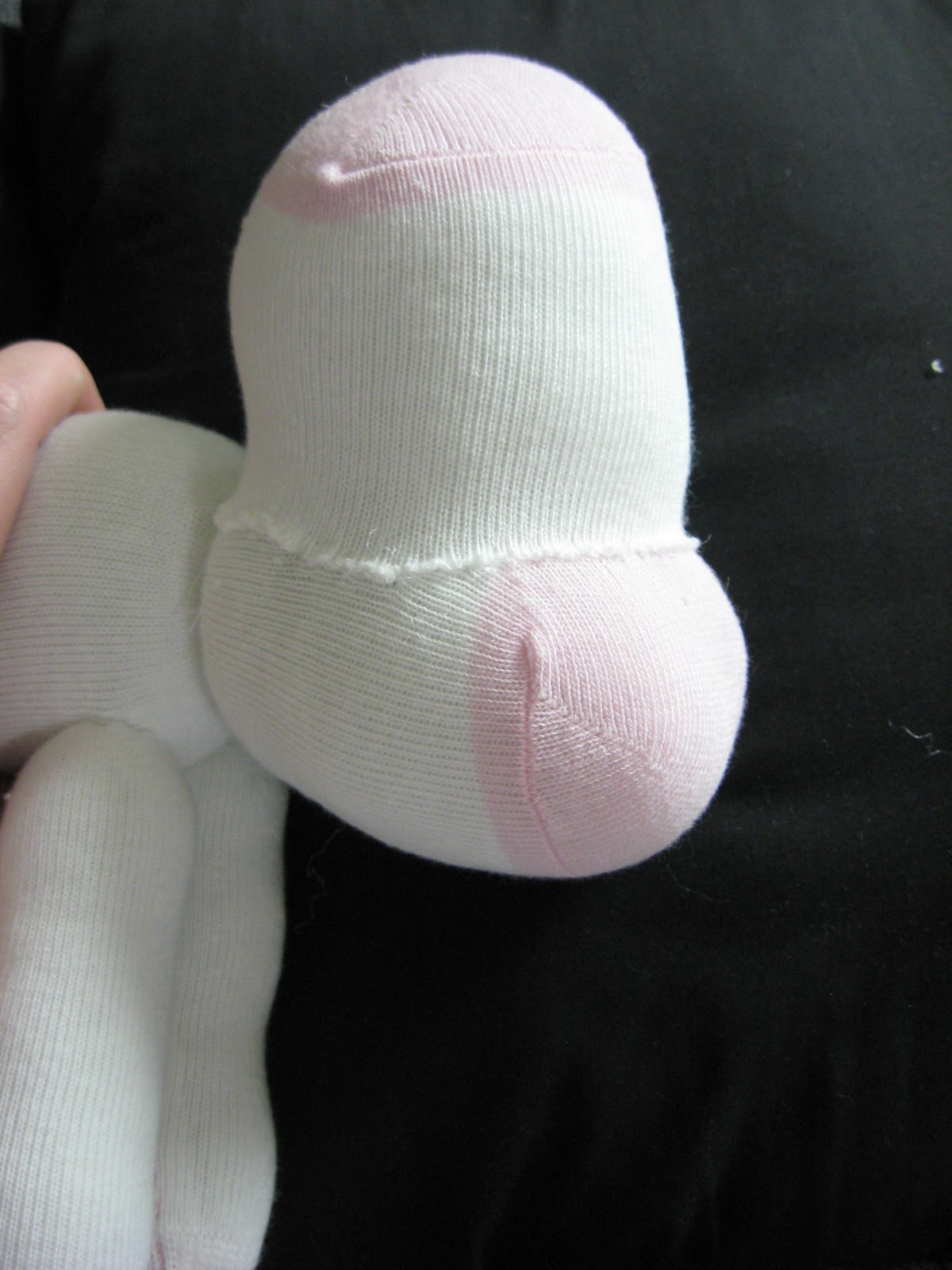 Stuff the toe portion from sock 2 and pin onto the top of the head. Line up the edge with the side of the toe on sock 1 (body sock). The front will overlap the pink some.